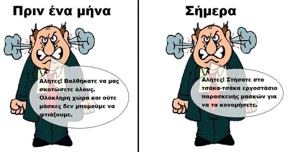 Κι εμείς που μέχρι πριν δύο μήνες κλαιγόμασταν και θρηνούσαμε που “ούτε μάσκα δεν είμαστε ικανοί να φτιάξουμε” (κανείς δεν ήταν), τώρα ουρλιάζουμε πως ο Νταβέλης (κοτζαμάν… Νταβέλης τι θα ‘τανε;) είναι κολλητός του Μητσοτάκη και πως ο Μπουμπούκος του κάνει… διαφήμιση για να “κονομήσουν όλοι μαζί το παρεάκι”…