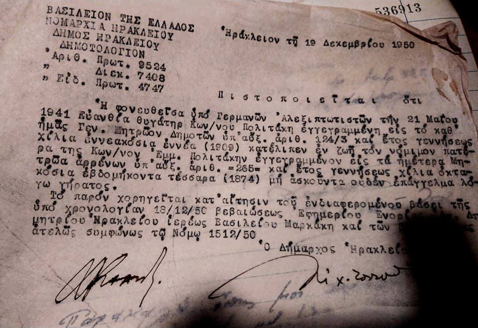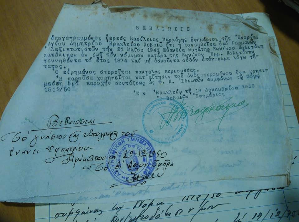 Περί “αναθεώρησης της ιστορίας”, “αλληλένδετων εγκλημάτων”, “ιπποτικων Αλεξιπτωτιστών” κλπ (βλ. Χαιντς Ρίχτερ, Νίκος Δήμου κ.α.): “Η φονευθείσα υπό Γερμανών Αλεξιπτωτιστών την 21 Μαΐου 1941, Ευανθία θυγάτηρ Κων /νου Πολιτάκη…”